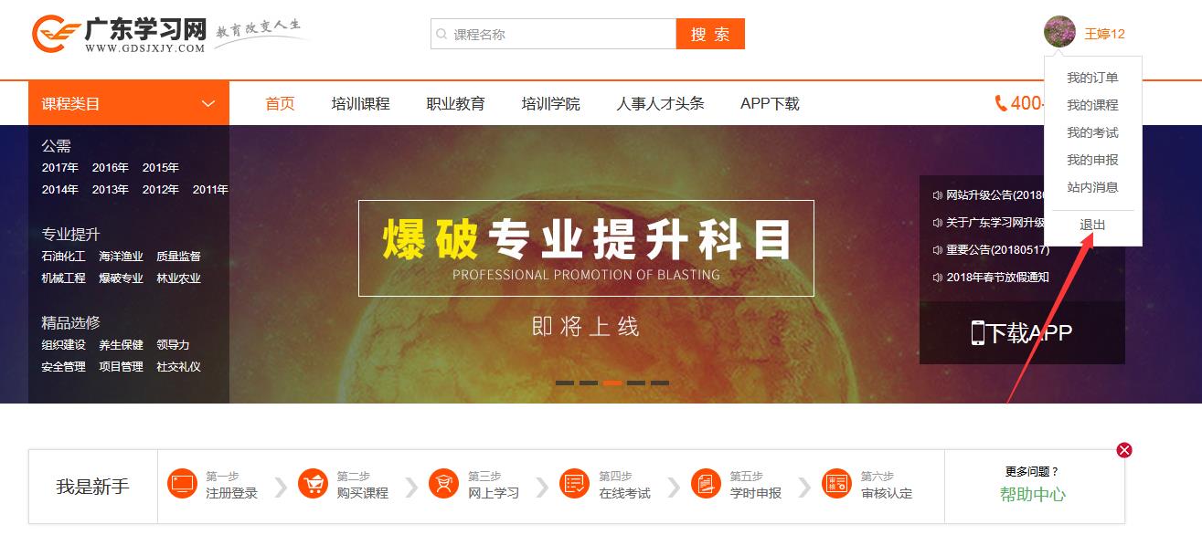 (1).在主页面中,把鼠标放在用户头像上时会弹出下拉菜单,其中有一项为“退出”,点击即可。