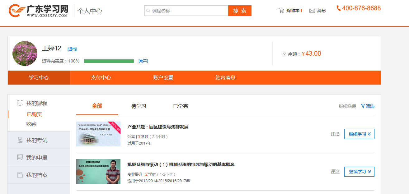 首先进入到“个人中心”->“学习中心”,在“我的课程”中可以选择查看“已购买”课程。